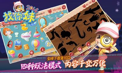 《找你妹2014》延续了“找物品”的核心玩法,融合RPG游戏元素。玩家在寻找妹妹的过程中,展开一系列冒险,经历“你妹饭店”、“梦幻海底”、“古墓迷踪”、“无尽宇宙”等数十种特色各异的场景,可使用上百种趣味道具,如“原子弹”、“庆丰包子”、“蓝屏按钮”等等,无数精心雕琢的细节和游戏难度、玩法的转换,给予玩家持续不断惊喜感和新鲜感,使玩家乐在其中。玩法中还新增了奖励模式、安检模式、数字模式、轮廓模式4种游戏模式,以更加自由便捷操作、精美清新的画风和诙谐动人的故事情节,将风靡全球大找茬风暴再次点燃。