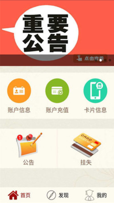 1.首页模块包括:账户信息、账户充值、卡片信息、公告和挂失功能;