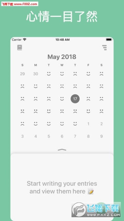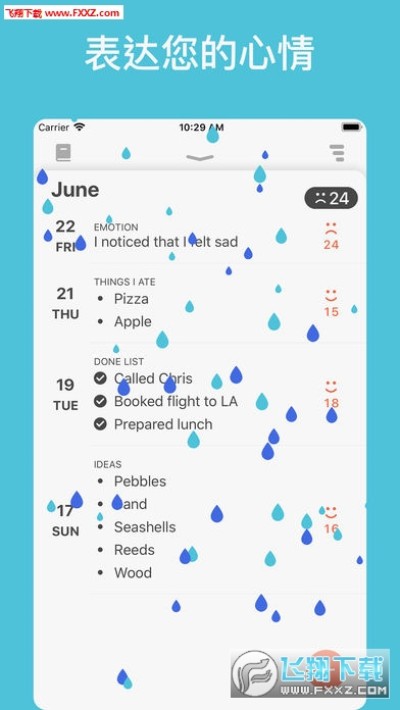 起来很小清新的应用,个雨滴和碎片是不同表情的动画效果,每一个条目添加很多个笑脸或者哭脸,数量代表了强度
