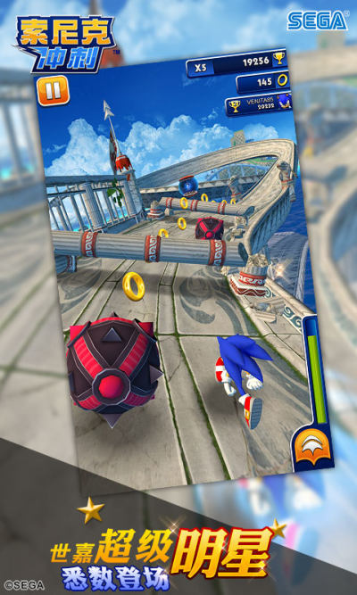 《索尼克冲刺》是日本老牌游戏商世嘉旗下王牌系列“刺猬索尼克”中的一款3D跑酷手游作品。《索尼克冲刺》作为一款3D跑酷类游戏,能让玩家在精致的画面中亲临索尼克世界,通过操作帅气的索尼克或他的小伙伴们凭借疾风般的速度,穿越重重障碍,击败拦路的怪物,通过BAZZ的考验,尽享别样跑酷乐趣!