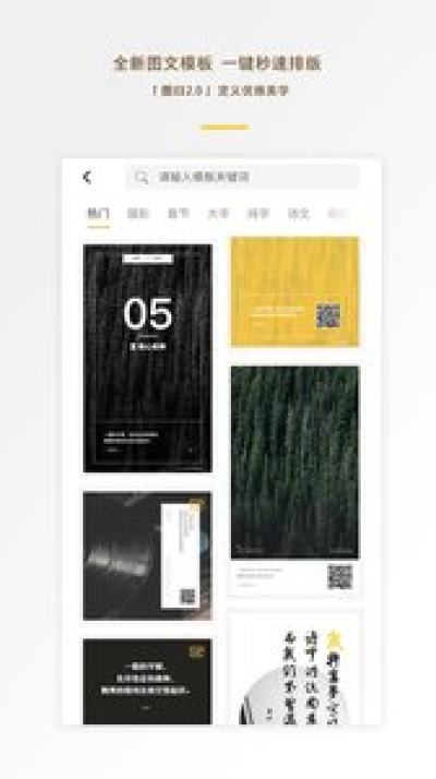时尚大气、简约文艺、旅游亲子、画报、海报、朋友圈配图、明信片、个人名片、日记故事、许愿贺卡、各类模版应有尽有。