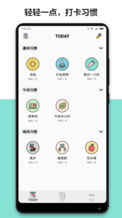 2.今天要坚持的习惯会单独呈现在 TODAY 页面中,轻轻一点图片即表示完成该习惯的打卡;