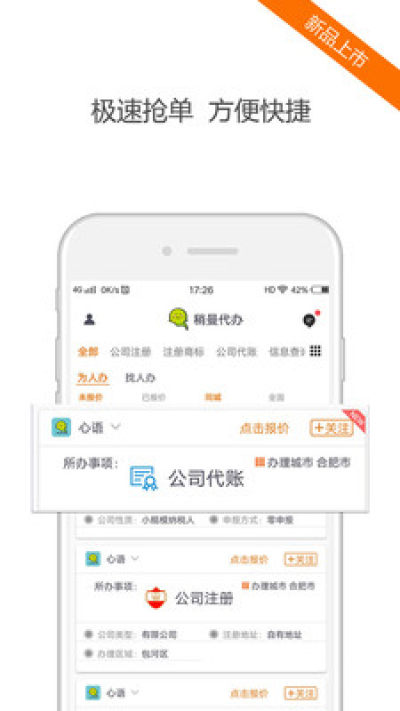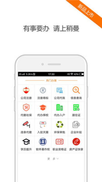 其产品包括公司注册、公司代账、代办入户、代缴社保、代办择校、违章处理、企业补贴、个人信息查询等数十种代办业务。该产品本着以实现天下没有难办之事为目标,不断前行。