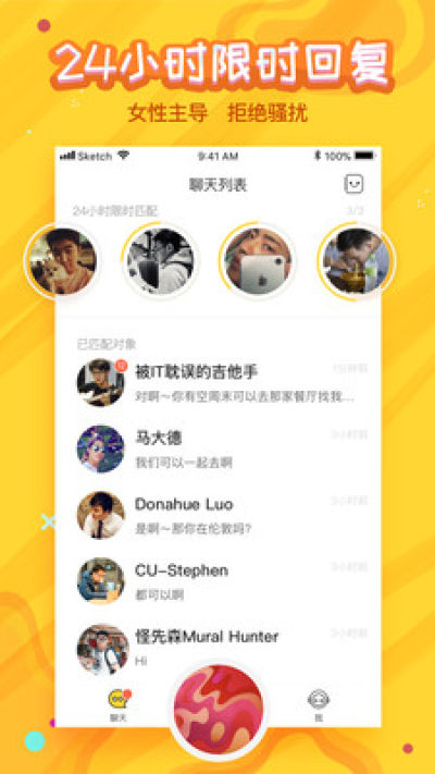 异性匹配后,女性用户可以选择在24小时内开始聊天,否则匹配将会失效。迈出一步,开始一段珍贵的感情吧。
