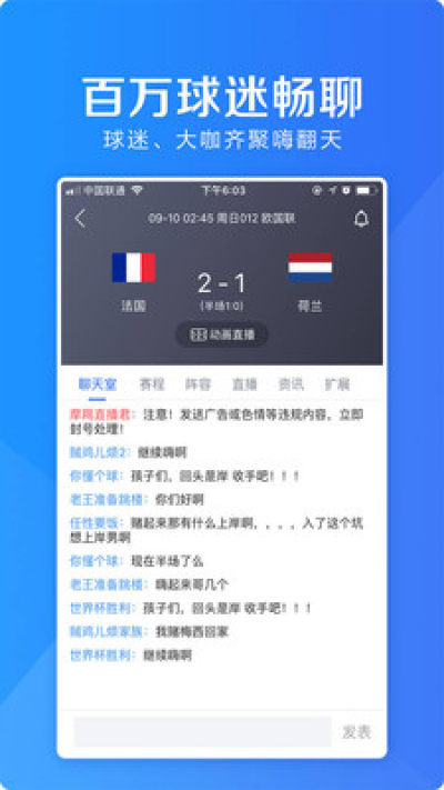 世界很大,我们汇集对的人!每天热门赛事多人在线,与球迷、大咖一起畅聊,享受球迷间的共同语言,让球迷更懂你,让你更懂球!