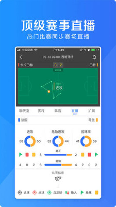 国内特有的足球赛事动画直播,场景展现丰富生动,准确及时还原赛场战况,真实享受直播快感,比分时间播报更加迅速,赛事统计更加全面,比赛场上信息更加直观,从此告别单调比分直播,享受动画直播的快乐。