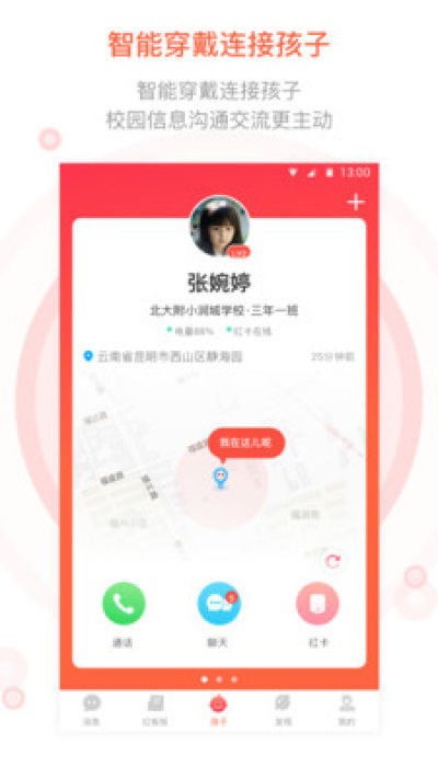 红卡和APP绑定,家长可以实时了解孩子位置,能够和孩子进行聊天、通话,还可以推送有趣、有意义的内容给孩子听。