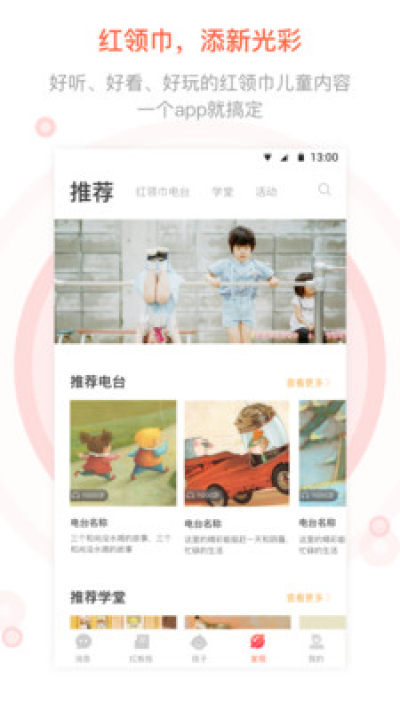 【电台】家长可通过APP将故事推送至孩子红卡,让孩子收听。数字红卡平台作为少先队内容官方发布平台,将各地区优秀的少先队内容呈现在APP中,为孩子成长提供健康的指导,引领孩子德育教育;同时我们也有丰富的少儿故事给家长选择,在内容中陪伴孩子成长