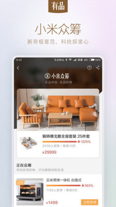 有品涵盖家电、家居、智能、影音、服饰、日用、餐厨、出行、文创等十余个品类,严格把控品质源头的同时,精简同品类产品数量,真正做到“好东西不用挑”。【小米众筹】也是有品平台的一大特色,智能科技前沿酷玩的产品为用户带来更多尝鲜体验。