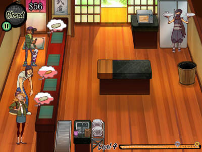 游戏在一开始很容易,只需要送送水就好可,但是随着关卡进行,料理的种类也变得越来越复杂,而需要加工的食物则需要很长的时间准备,所以如何分配时间是游戏的关键。有时在关卡结束后能够进入商店,用经营获得的钱进行升级,能对你有很大的帮助。