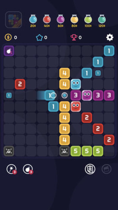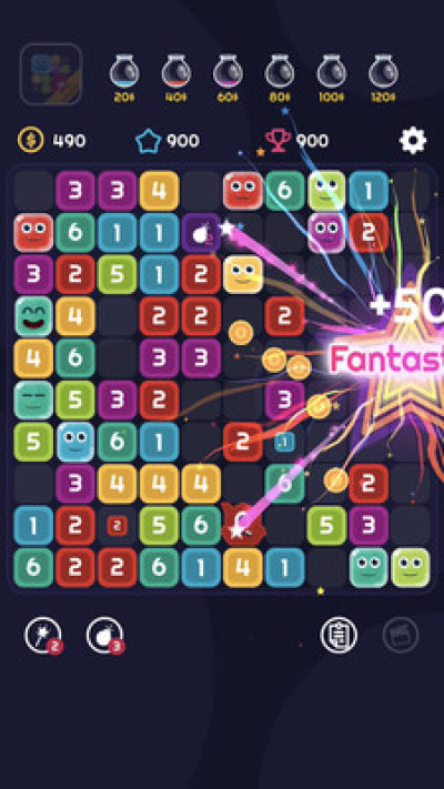 移动相同颜色的方块,将它们排列成大于或等于5个,以生成其他颜色的数字更高的方块!