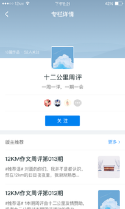 “十二公里(12KM)”是一个面向中学生的写作社区,由广大学生和老师创造优质的文学内容,培养学生的写作能力和写作兴趣,搭建优质的写作社交圈;同时为老师提供便捷的线上作文教学应用,构建老师的语文教学公益组织。