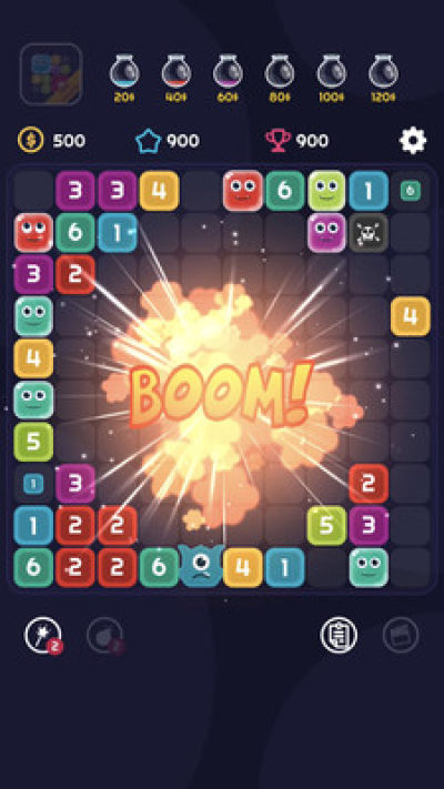 移动相同颜色的方块,将它们排列成大于或等于5个,以生成其他颜色的数字更高的方块!