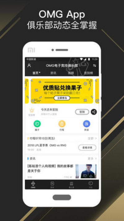 这里是OMG电子竞技俱乐部官方社交APP,身为59e的你可以在这里快速了解俱乐部动态,队员在基地的各种日常小故事,还可以通过问答和队员亲密互动!不仅如此,我们还会提供全面丰富的电竞资讯,精准迅速的赛事数据服务,还有专属战队周边、福利活动等你来体验,赶快加入到OMG电子竞技俱乐部大家庭吧!