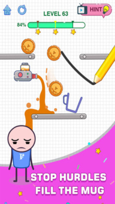 一款非常经典的脑力游戏,游戏每一个关卡都需要你采用画画的方式,画出线条,引导咖啡流进玻璃杯,非常具有挑战性,有些关卡很难,游戏吸引了许多粉丝!