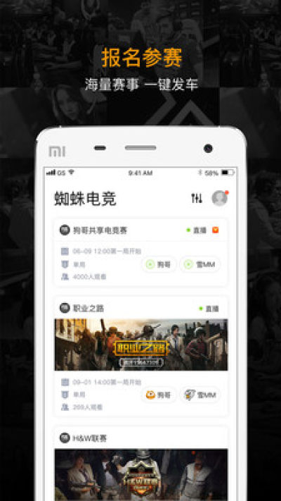 《蜘蛛电竞》app打造全新的电竞娱乐圈!为用户提供一个具有官方性的民间赛事组织平台,让用户直接自由开黑,享受全新的电竞乐趣,并且比赛具有公平性!需要的话就赶紧下载体验吧!