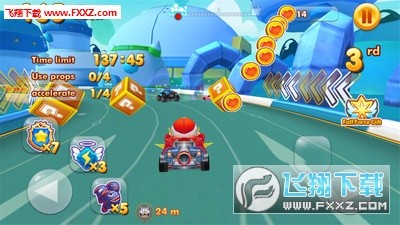 这是一款以卡通风格的跑跑卡丁车玩法的赛车游戏。