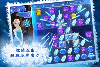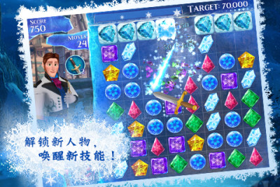 - 每个角色独有的升级系统:使用安娜的“火焰消除”烧尽整排冰晶, 或者用埃尔莎的“冰雪粉碎”来消除所有同色冰晶!尝试汉斯的“宝剑”击碎冰晶,通过探密深入,获得更多炫酷技能!