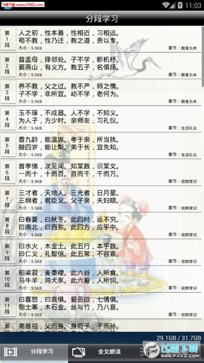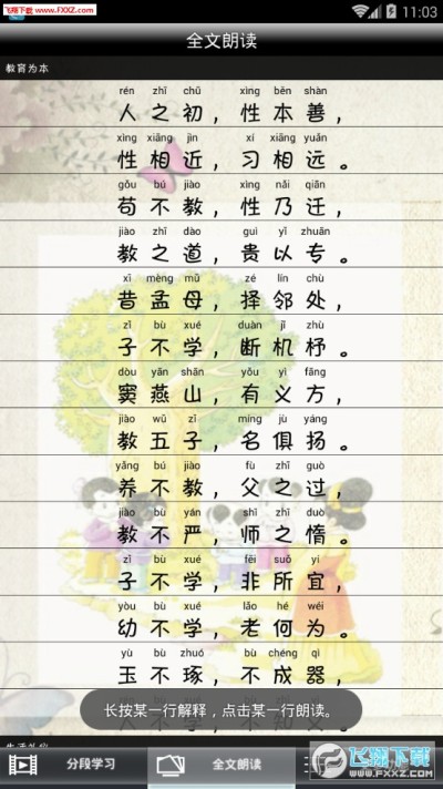 2、两种学习模式:一种分段朗读解释便于孩子家长共同理解学习三字经;一种全文顺序循环朗读,逐行跟踪滚动显示当前朗读内容,便于孩子跟随一起咏读学习;