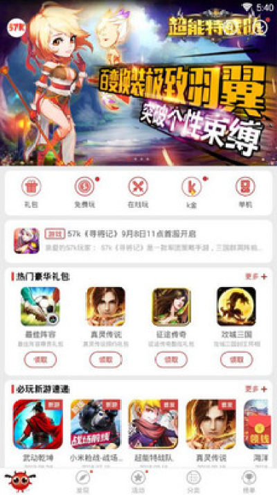 《57k游戏》app是集手游礼包和试玩的游戏资讯平台,软件内含海量热门小游戏免费在线畅玩,而且拥有大量游戏虚拟商品福利相送,用户一键即可领取;需要的话就赶紧下载体验吧!