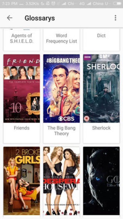 3.单词列表,包括从九部英/美剧中统计的单词频率表,以及最常用的一万七多个词汇,多种排序方式,卡片背诵,同时还支持查询单词(支持查询牛津字典的英英解释),记录到生词本等。