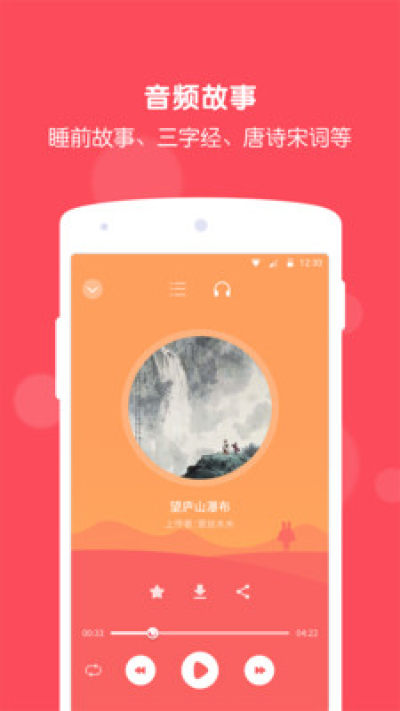 兔耳故事是一个会讲故事唱儿歌、可以教宝宝手工课简笔画的儿童有声伴读早教app,包含了热门儿歌、绘本故事、睡前故事、安徒生童话、经典国学、唐诗宋词、手工课视频、简笔画视频、育儿知识分享等内容,并由专业的配音人员做成有声读物,并对不同的资源进行了科学合理的分类。针对不同年龄层、不同孩子的喜好精心挑选优质内容,在各种精美的插画和富有感情的朗读中,潜移默化的影响TA。
