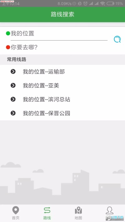 点击下方图标进入“路线”界面;可以输入“我的位置”、“你要去哪?”及常用路线搜索;