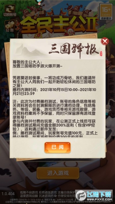 《全民主公2》是一款以三国世界观为背景的塔防策略手游,是手游《全民主公1》的正统续作,游戏以风起云涌、英雄聚会的三国时代为背景,致力于还原三国宏大史诗战争场面。玩家可将三国名将招募麾下,自由个性养成,组建百变阵容,体验丰富趣味的各类玩法。