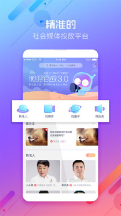 《微呼百应》是一款基于大数据匹配精准的社交化媒体分发平台,以朋友社交圈、共同爱好、同标签人群为纽带,全面覆盖本地媒体、本地名人、微信、微博、自媒体、各平台公众号等渠道,从而帮助广告主快速抓住消费人群的平台。