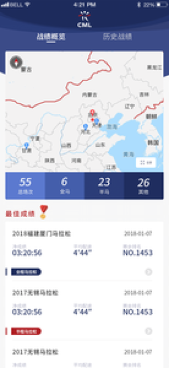 4.历史成绩查询,跑过专业马拉松赛事的跑友可以通过该功能查询自己的历史比赛成绩