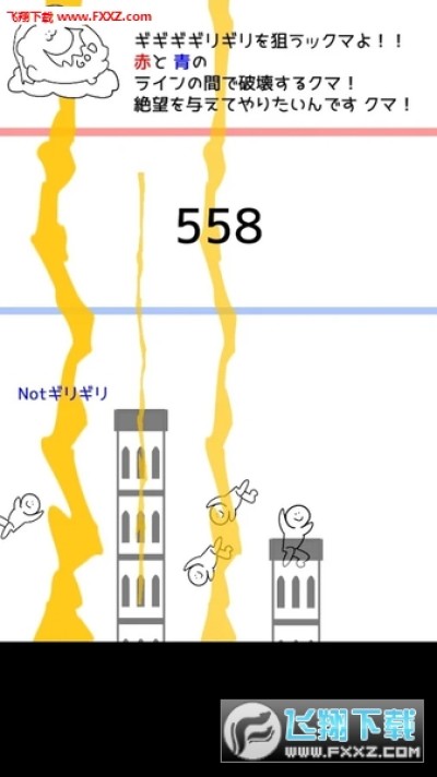 当塔顶越过红线时则会game over,塔顶没到蓝线时降下天雷塔不会被破坏,这会让神很僧器,并在一段时间内没法使用天雷。