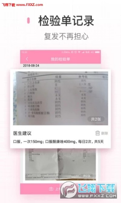 6.检验单记录:上传白带常规检验单并记录医生建议,下次复发时治疗方案一目了然。