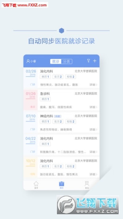 2.自动同步病历资料:在医院就诊后,云病历将帮您获取就诊所包含的病历、处方和检查报告,并及时同步到您的手机中,方便回顾与查阅。