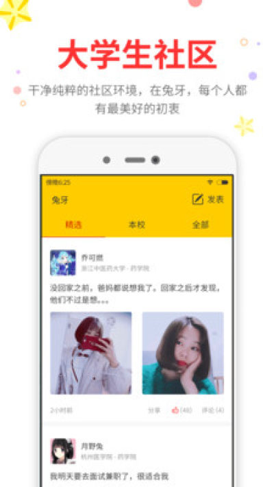 介绍:兔牙是个大学生社区,没有很多功能,只为大学生之间的分享和交友。兔牙的男生喜欢描述学校发生的新鲜事儿,女生喜欢爆照,在兔牙你可以认识更多的本校同学,还能与很多其他学校的人做朋友。