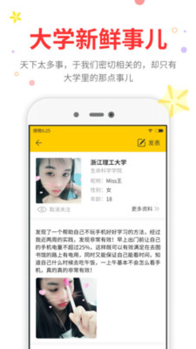 全新大学生活社区,在这里你可以认识全国各地不同学校的大学生,她们中有很多都是单身学妹哦~只要稍微用点心,关心一下她们的日常生活,你就可以非常轻松的摆脱单身狗的尴尬身份,从此再也不用被喂狗粮啦~