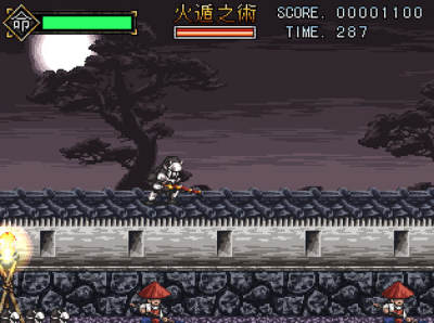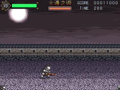 忍者有五条命,死亡后当前关卡重新开始。配合方向键,角色可以向上射击,跳跃时可以向下射击,忍者可以二段跳。使用忍术会消耗能量,忍术可以连续使用。游戏中敌人的数量会突然增多,盲目突进很容易就挂了。