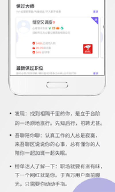 你可以在一键搜索到各大招聘平台的岗位,并与该岗位的从业人员快速沟通,详细了解岗位情况,或邀请从业者保障到岗。