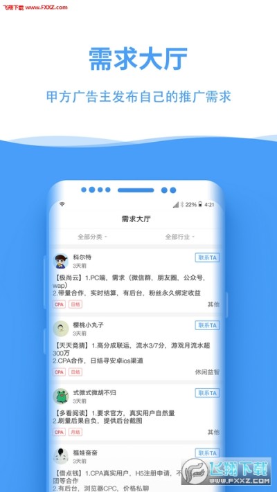 3.可在“供需广场”发布CPA、CPS形式的推广需求,届时将有海量流量主与您取得联系;