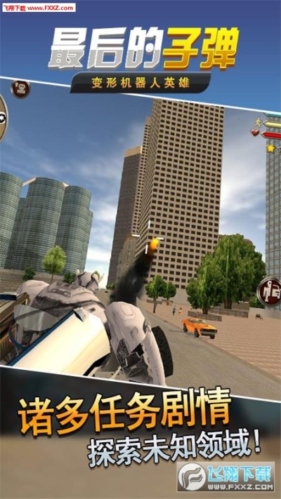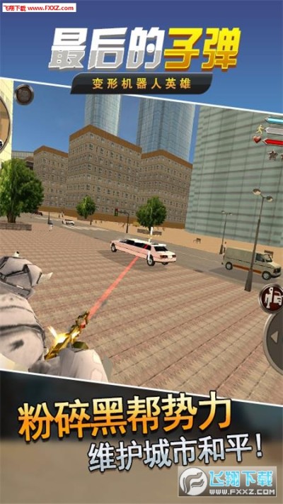 最后的子弹(变形机器人英雄)是一款超级好玩的动作游戏。邪恶的机器人在危害这座城市的和平!身为变形金刚汽车人的你要挺身而出,利用自己优秀的武器和变形能力来打败他们守护城市和平!现在,做好准备,拿起你的武器装备,消灭城市中邪恶的机器人,成为这个城市的英雄吧