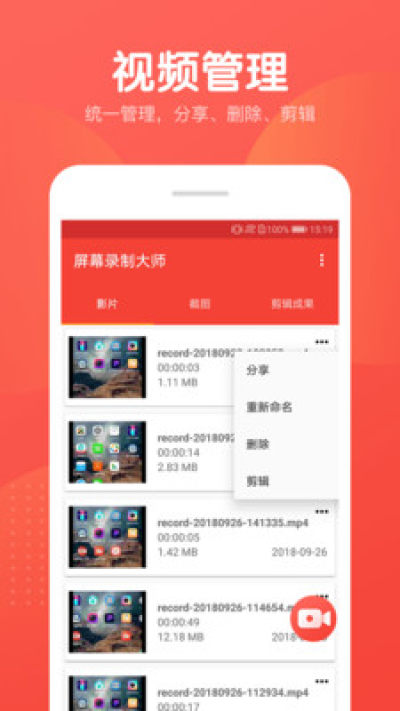 通过内置管理模块,统一管理您录制的影片,可进行重命名、删除、分享等