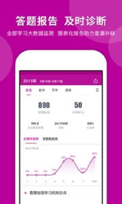每次作题,系统都详细记录,自动生成答题报告,答错量、正确率、全站答题排名、正确率趋势、错误率趋势一目了然,需要加强的知识点,系统自动推荐。
