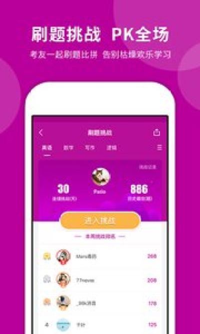 告别孤独备考学习路,刷题挑战,PK全场,和朋友同学一起刷题游戏,连续刷题天数、历史刷题量、刷题挑战记录,刷题周排行榜,多种玩法欢乐备考。