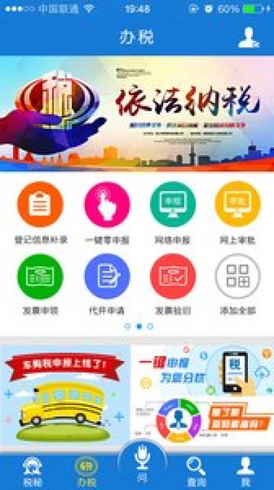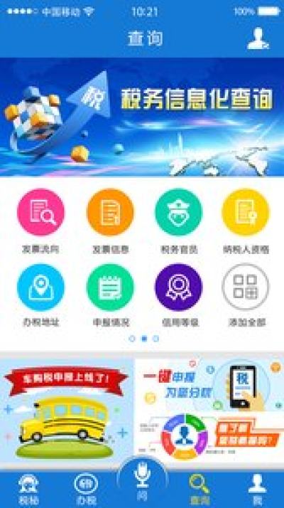 3、【综合查询】 发票查验、发票流向查询、丢失以及被盗发票查询、发票遗失声明、纳税人资格、纳税人状态、税务登记、申报情况、出口退税查询。
