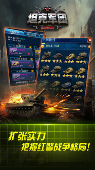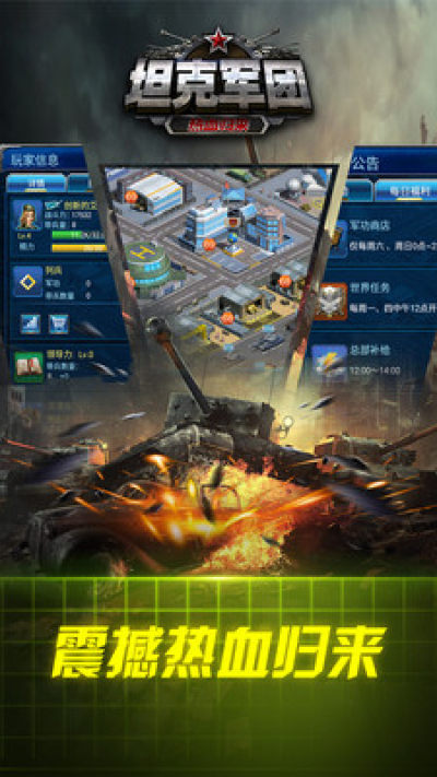 重装来袭!给您带来不一样的战争SLG体验!结合红警现代战争的故事背景,突出策略和布局的大将玩法,轻松的战斗和PK模式,丰富的建筑强化系统,多样的任务系统,组建专属于您的坦克军团,与其他军团一决高下,扩张势力,成为战争霸主!