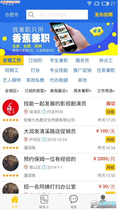 香蕉兼职已建成兼职招聘全流程管理系统、兼职管理和即时通信系统、企业动态用工需求库、黑中介智能筛选屏蔽等多个智能系统,是一站式的兼职用工解决方案提供平台。平台汇集海量灵活用工岗位服务信息,依托智能分析与大数据,筛选出诚信安全的兼职信息,保障个人用户的兼职人身安全。特点是所有发布招聘信息须身份认证,最大限度地保障了求职者的工作安全。