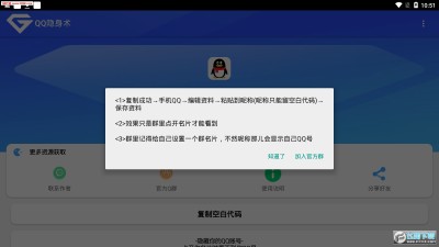 安卓-QQ号隐藏助手,利用代码来隐藏QQ号,只能在QQ群内有效,打开软件,复制代码,去群名片中黏贴复制即可QQ号隐身术,隐藏你的QQ账号,别人点开你名片时就看不到QQ号,超级装逼,而且不想要的时候就可以恢复!