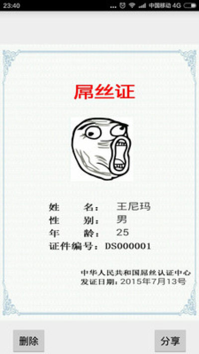 这是一款快速制作搞笑证件的工具,用户只要输入基本信息选择头像,就可以一键生成证件,分享到qq或者微信朋友圈去,快来试试吧!