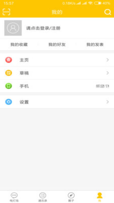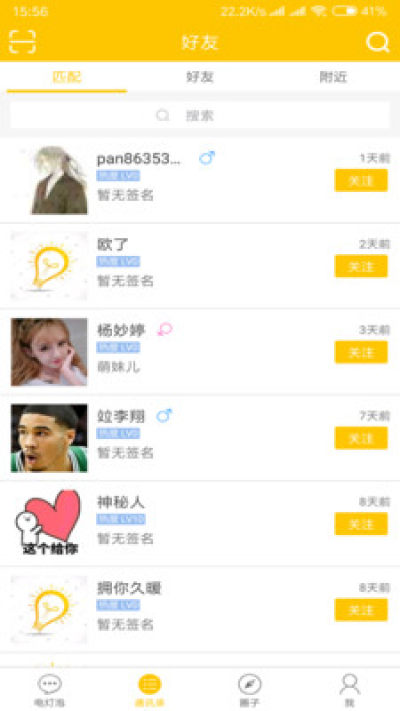 《电灯泡聊天软件》app是一款以简约为主题的聊天交友平台,集聊天、通讯录、附件匹配、社交圈四大板块,没有多余的东西,聊天就是这么简单;在这里,大家都是陌生人!期待你的加入!