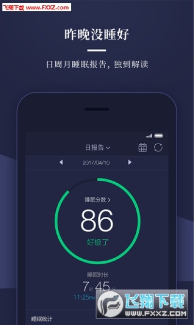 App监测每晚睡眠数据,可视化报告让你了解整晚的睡眠质量、睡眠周期、睡眠深浅、入睡时长、翻身、离床等等情况,并提出改善睡眠的建议。