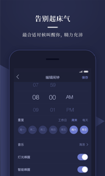 智能闹钟在早晨你睡得很浅的时候轻轻唤醒你,让你像自然醒来一般,告别起床气,一整天精力充沛。
